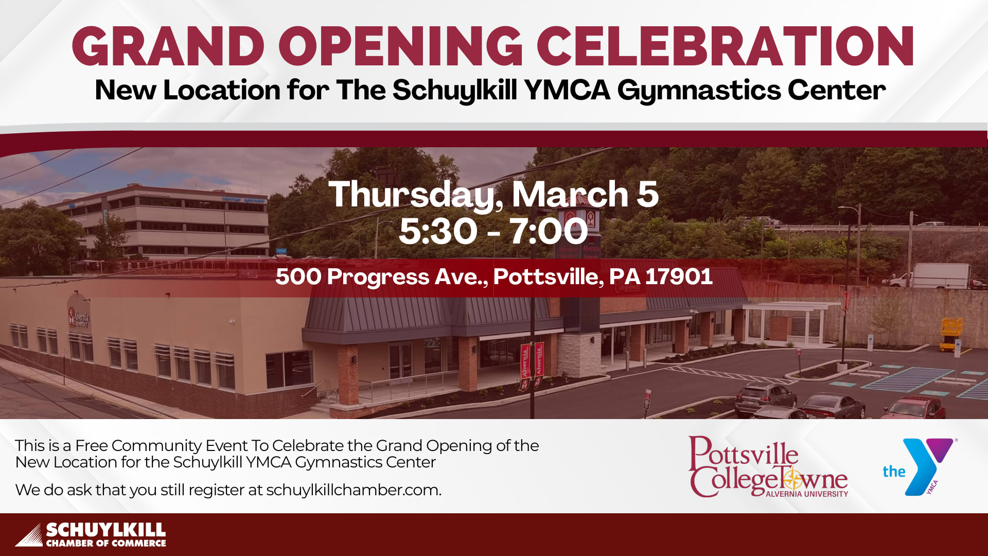 Join us on March 5 from 5:30 to 7:00 PM as we celebrate the grand opening of the new Gymnastics Center at the Schuylkill County YMCA with an official ribbon cutting ceremony. The new center is located at Alvernia University Pottsville CollegeTowne, 500 Progress Avenue in Pottsville. This exciting addition represents a meaningful investment in youth development, health, and opportunity within our community. Designed to provide a safe, modern, and inspiring environment, the gymnastics center will support young athletes of all skill levels as they build strength, confidence, discipline, and teamwork. The evening will include brief remarks, the ceremonial ribbon cutting, an opportunity to tour the new facility, and time to connect with fellow Chamber members and community leaders. Light fare will be provided. We invite you to join us in celebrating this important milestone for the YMCA and for the families and young athletes it will serve throughout Schuylkill County.