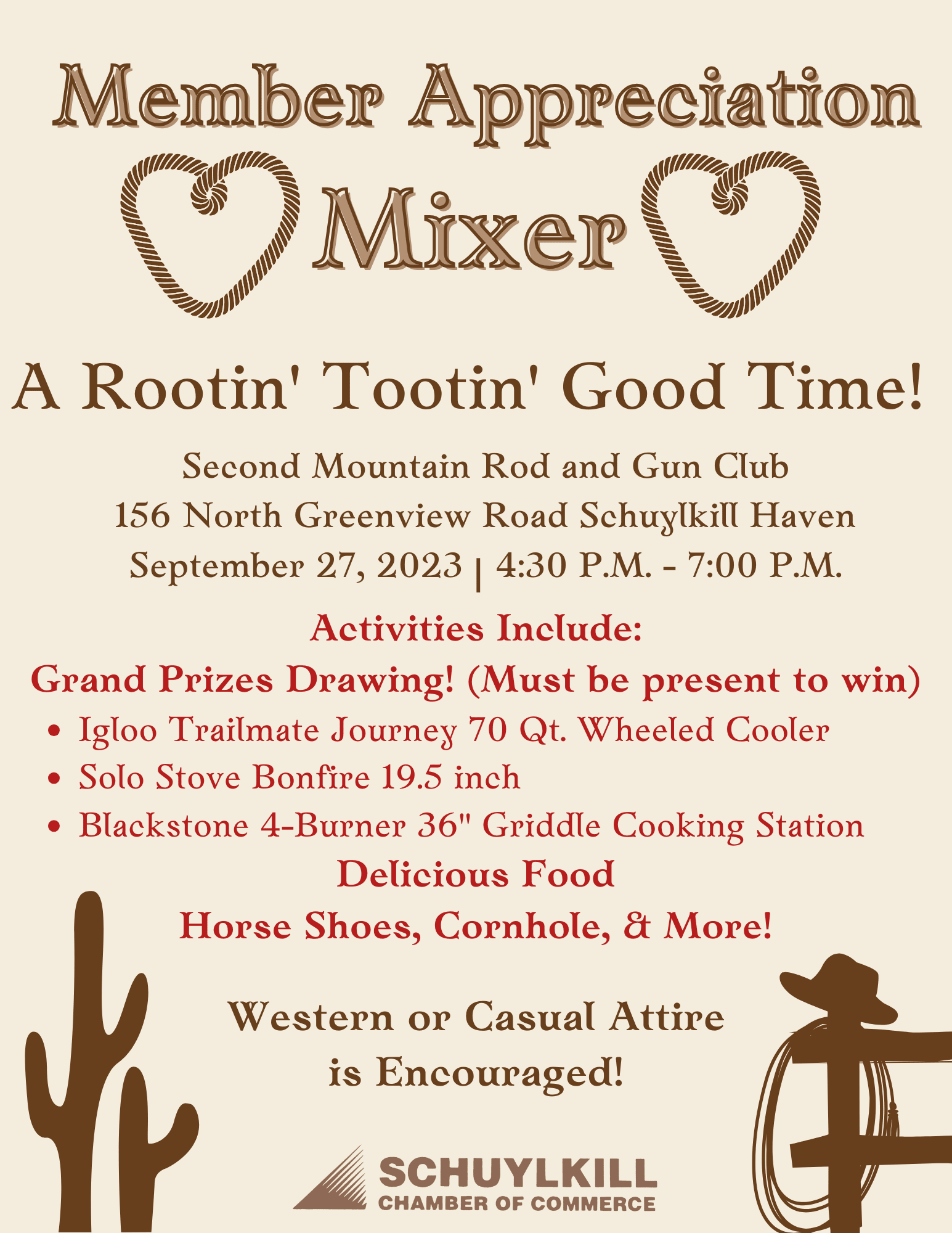 Our members are invited to join us at our Member Appreciation Mixer on September 27 at the Second Mountain Rod & Gun Club from 4:30 p.m. - 7:00 p.m.
