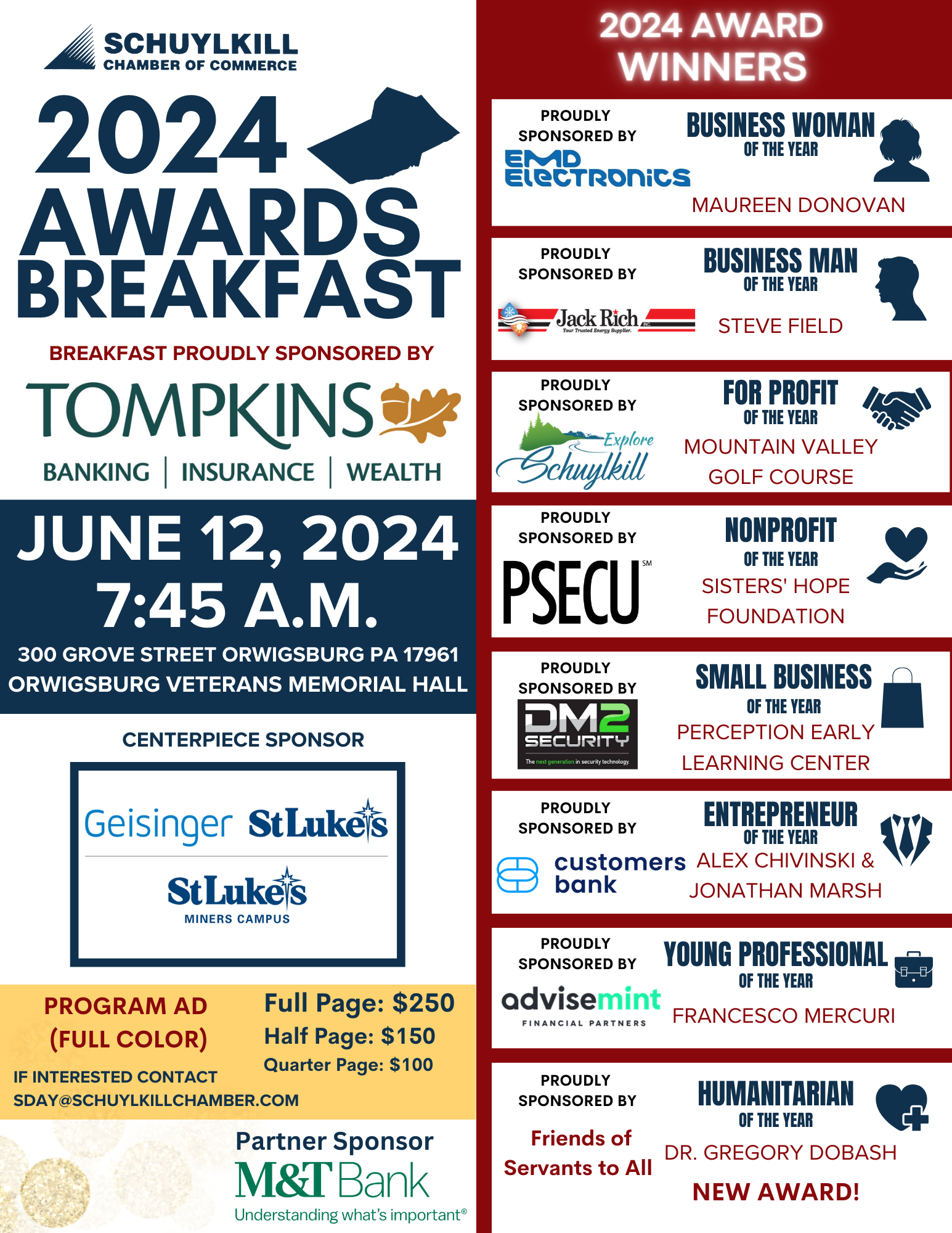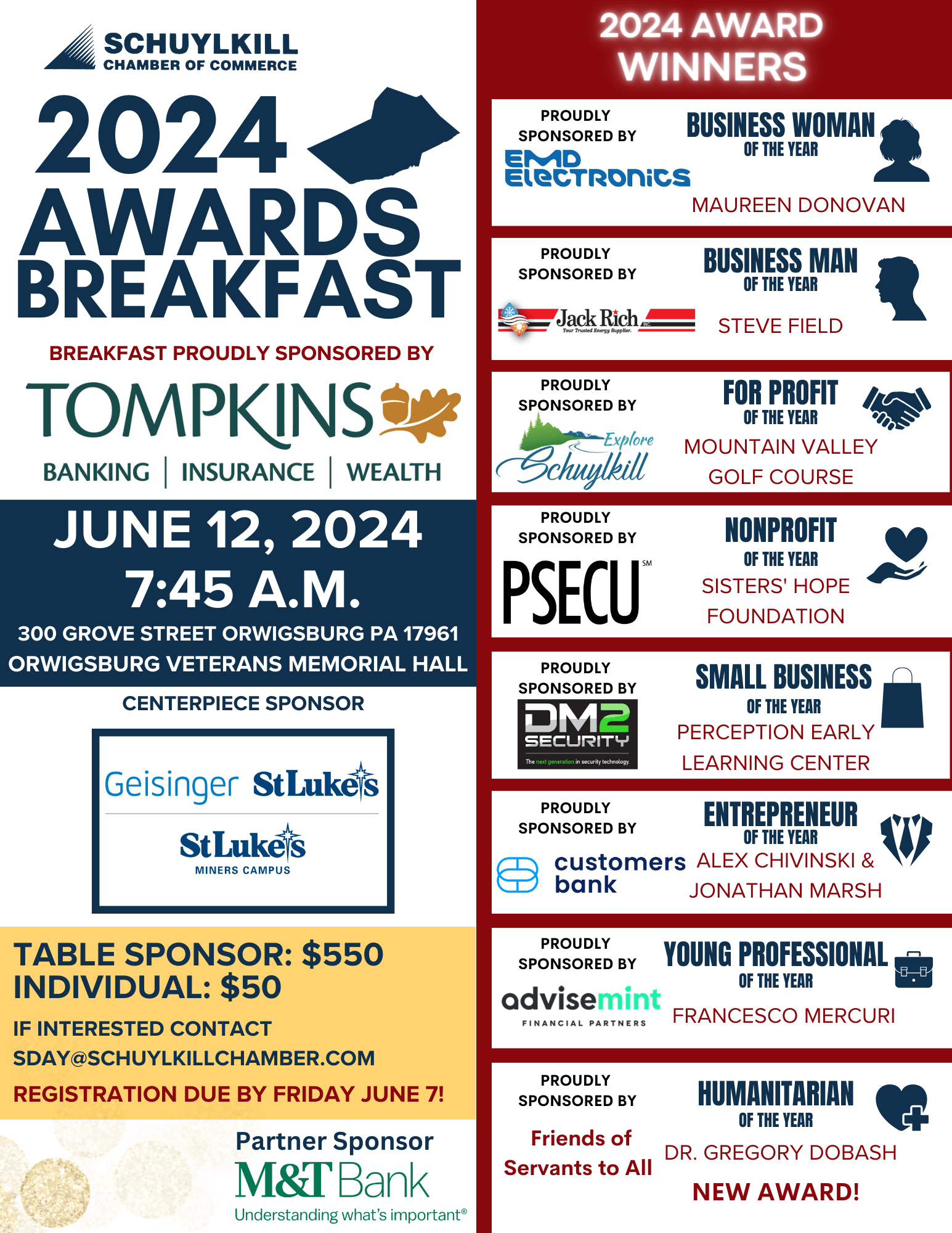 Join us for our Awards Breakfast on June 12, 2024! Awards are given for the Business Woman, Business Man, Entreprenuer, For-Profit, Small Business, Nonprofit, Young Professional of the year & Humanitarian of the Year!
