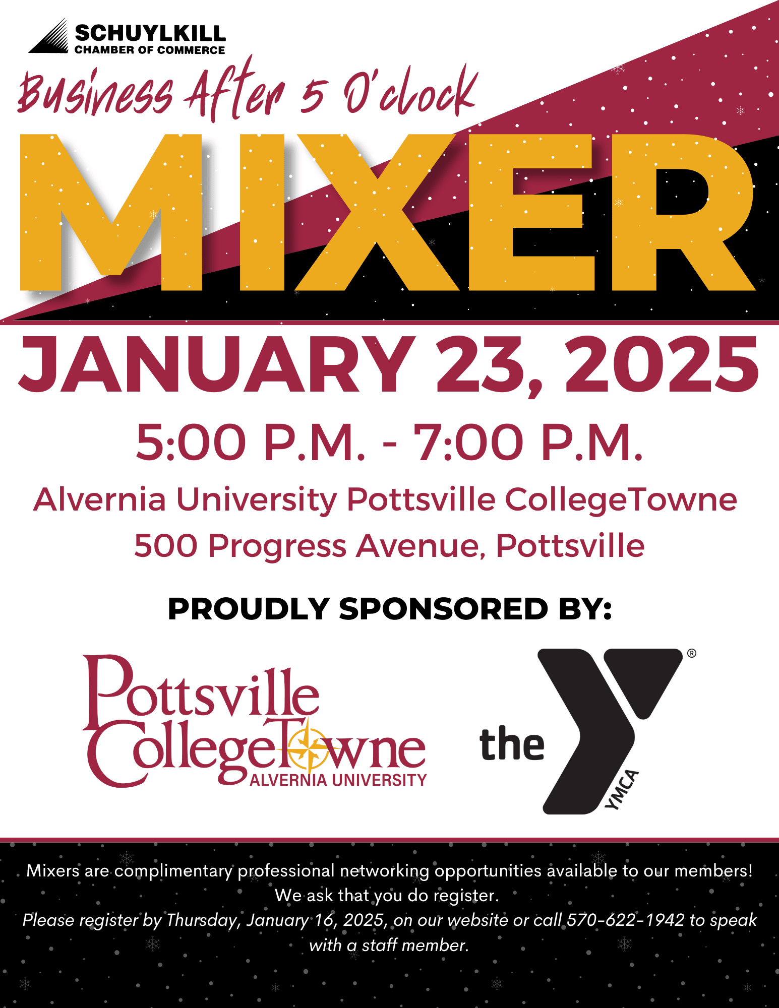 The Schuylkill Chamber of Commerce's Business After 5 O'Clock Mixer in January is proudly sponsored by Alvernia University Pottsville CollegeTowne & The Schuylkill YMCA.