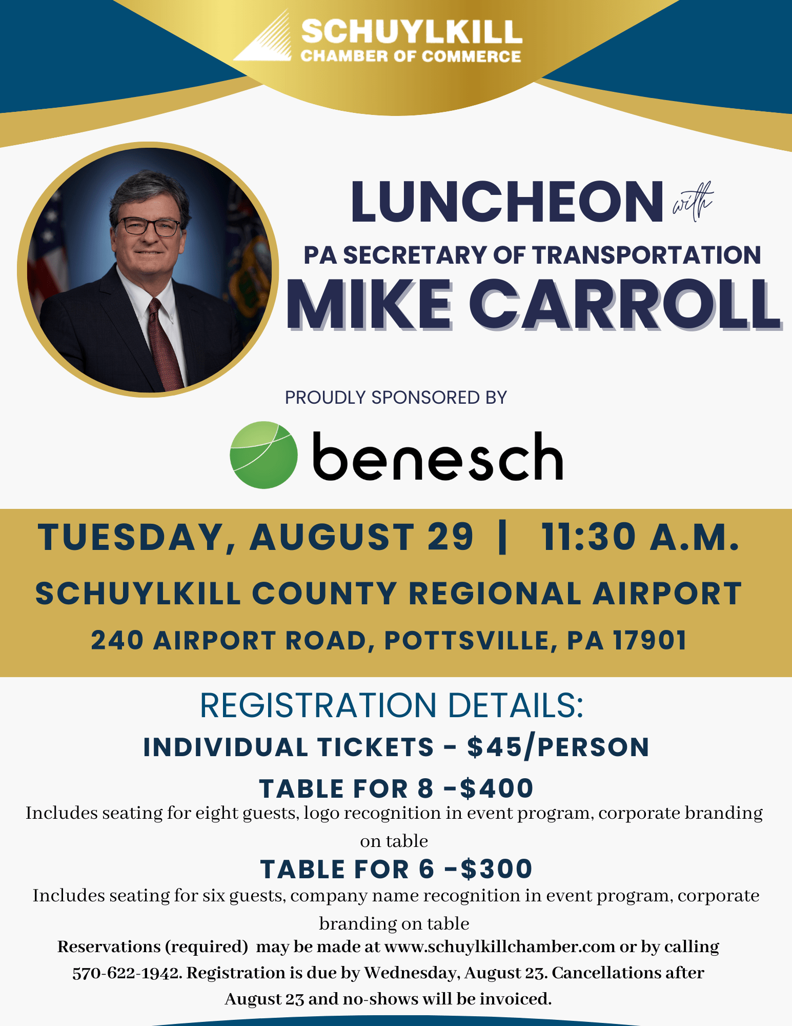 We invite you to join us for a luncheon with PA Secretary of Transportation Mike Carroll. The luncheon is proudly sponsored by Benesch.