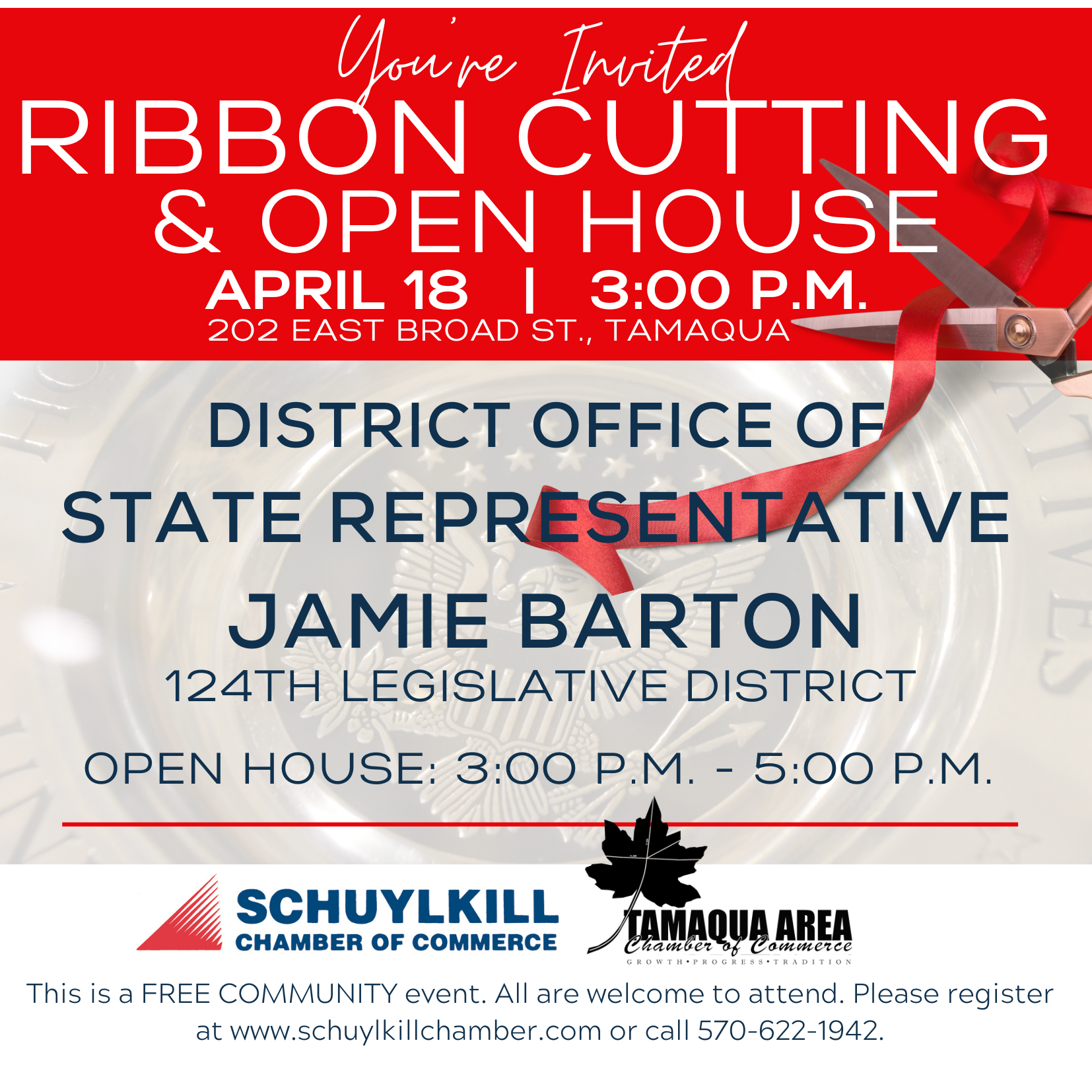 The Schuylkill Chamber of Commerce and Tamaqua Area Chamber of Commerce invite you to join us for a ribbon cutting celebration and open house at State Representative Jamie Barton's Office in Tamaqua!