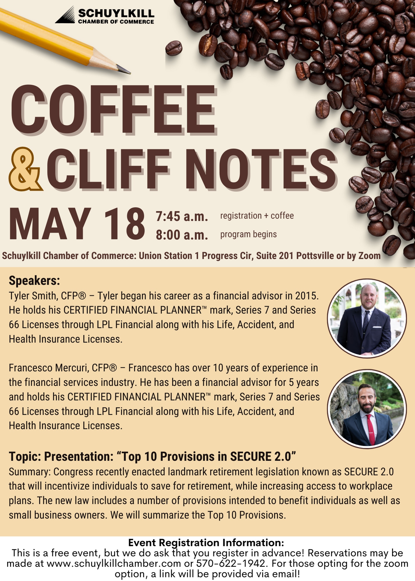 The seminar will be hosted at the Schuylkill Chamber of Commerce, 1 Progress Circle, Suite 201, Pottsville, PA 17901 or on Zoom. The topic for this Coffee & Cliff Notes is Top 10 Provisions in SECURE 2.0.
